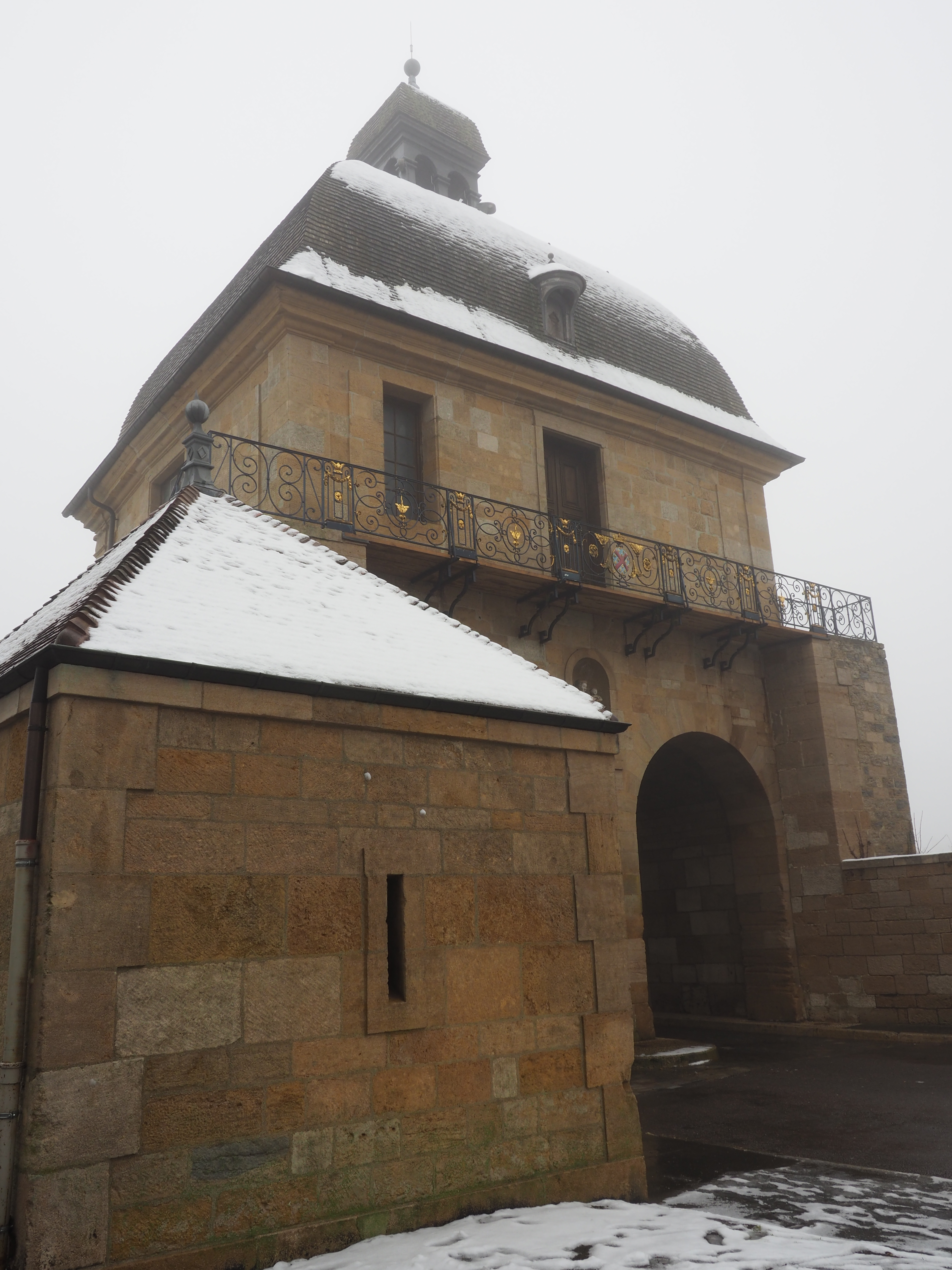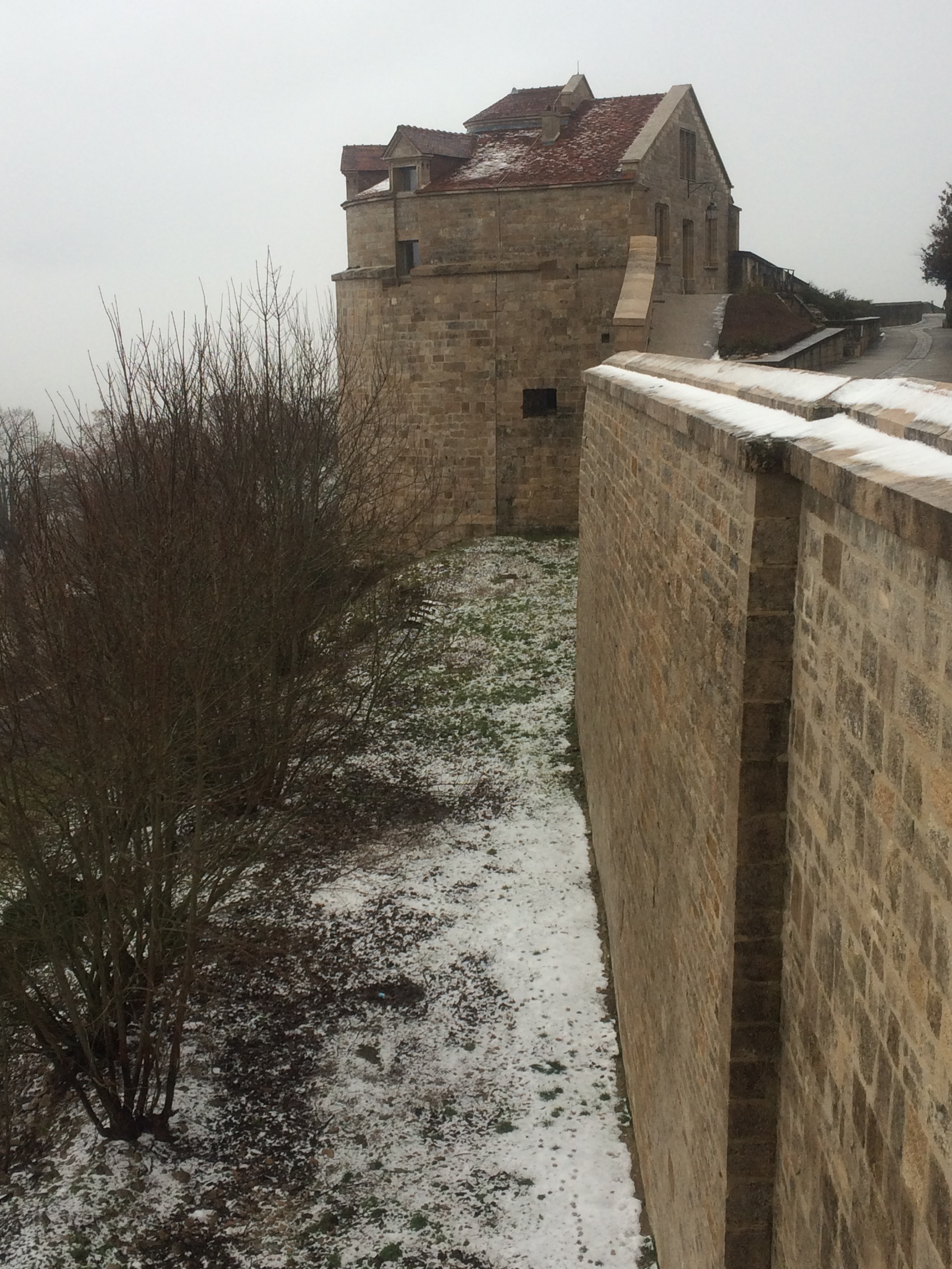 Nous sommes arrivés à Langres vers 11h30 et nous avons garé la voiture au pied des remparts (stationnement gratuit, bonne surprise !). La brume et la neige donnaient un côté hostile à cette cité de l’Est, mais nous ne nous sommes pas découragés. Nous sommes montés sur les remparts et avons commencé à faire le tour de la ville par le sud. Langres est une ville fortifiée : 3,5 km de remparts, comprenant encore 12 tours et 7 portes. La balade, un peu fraîche, était néanmoins très agréable. Nous avions nos chaussures de marche, ainsi nous ne dérapions pas sur les restes de neige. J’ai aimé observer les mâchicoulis, les créneaux, les échauguettes, les restes de pont-levis et les arches imposantes des fortifications. Le long des remparts il y avait aussi des petites maisons qui semblaient se serrer les unes contre les autres comme pour se tenir chaud, avec des jardins très mignons (qu’est-ce que ça doit être en été !). Langres étant à 500 m d’altitude sur son plateau, il paraît que la vue est intéressante sur la vallée et au loin les reliefs, mais…la brume mes amis, la brume ! Nous n’avons pas pu profiter du paysage, il faudra revenir !