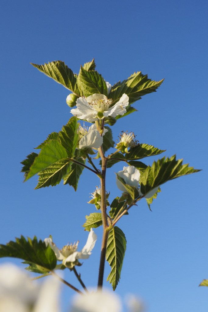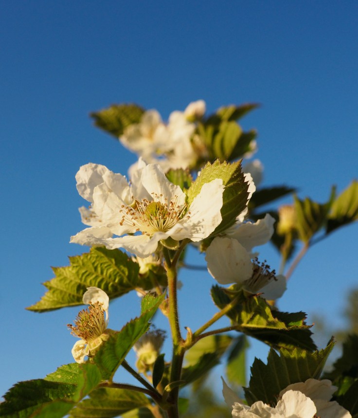L’an dernier, en plus, ces mûres n’ont pas eu le temps de mûrir qu’elles étaient déjà sèches. Quelle déception. Je n’ai pas bien compris ce qui s’est passé. Maladie ? Canicule ? Croyant mon buisson complètement cramé, j’ai taillé tout ce que je considérais comme du bois mort. Il n’en restait plus grand chose… et surprise : tout ce qui restait a repris ! Il s’est mis à faire des feuilles et des feuilles et à grandir, grandir ! Si j’avais su, j’en aurais peut-être laissé plus, en fait ce n’était pas cramé du tout. Il aussi fait les magnifiques fleurs qui illustrent cet article. Espérons que cette année, les fruits aillent jusqu’à maturité sans encombre !