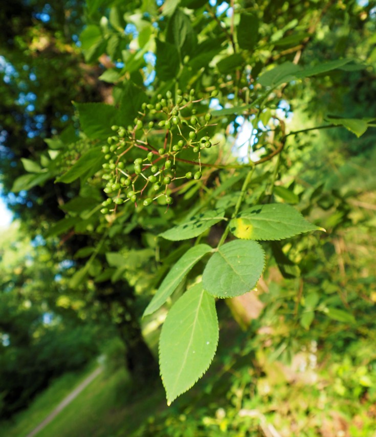 Une petite pause parmi les géants, voici un arbrisseau (max 6 mètres) très connu par les amateurs de magie et de mythologie, notamment celtique dans laquelle il est l’arbre des morts. Son bois creux et tendre a servi à faire des instruments de musique. Sur la photo, les fruits sont encore verts, mais mûrs, il deviennent noirs et pendent (détail très important pour l’identification). On en fait du sirop ou de la confiture, mais attention à ce qu’ils soient bien mûrs et bien cuits.