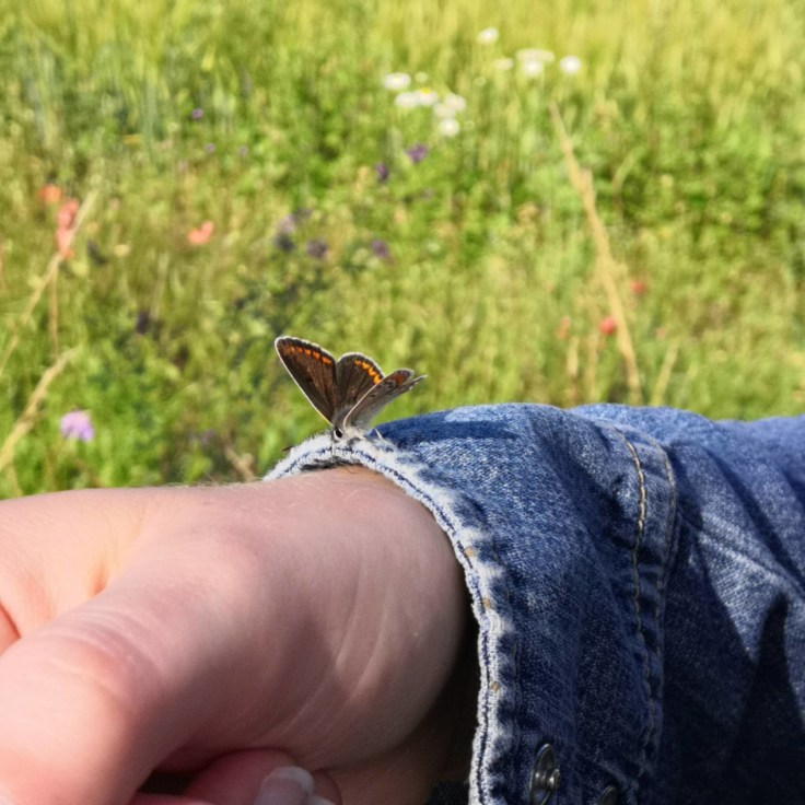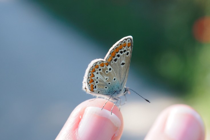 Juste avant de quitter les champs pour le couvert forestier, je photographiais une coccinelle remuante sur une scabieuse des champs quand un papillon est venu se poser sur l’appareil, puis sur ma main, puis il ne fut plus question pour lui de me quitter tant que je ne lui avait pas très sérieusement tiré le portrait. C’est limite s’il n’exigeait pas de voir le résultat sur l’écran entre chaque pose. Qu’il était beau, avec ses taches orange, ses antennes rayées et surtout ce bleu vif sur son corps et ses ailes. Son petit nom ? Collier de corail. Même son nom est joli et fait rêver. Je continuais de marcher vers la forêt avec mon charmant passager et ce n’est que lorsque nous avons atteint l’ombre des arbres qu’il a finalement choisi de rester dans sa prairie, non sans m’avoir demandé l’adresse du blog où seraient publiées les photos, bien sûr.