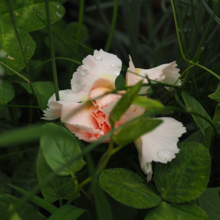 Dans cette fleur, ce qui m’interpelle, c’est sa coquetterie (vous n’imaginez pas combien de temps peut s’écouler entre l’apparition du bouton floral et l’éclosion de la fleur d’oeillet ! une vraie diva). J’aime aussi particulièrement sa grâce et et toute la douceur apportée par la couleur rose pâle. Aussi, j’ai choisi pour la photographier un jour couvert, pour que la lumière diffusée par les nuages soit douce et que la couleur pastel soit bien mise en valeur. Au post-traitement, je n’ai pas joué sur la saturation, justement pour garder le ton pastel. J’ai photographié en gros plan pour flouter l’arrière plan et surtout l’avant-plan. Et puis cela permet aussi de montrer les gouttes qui ornent la fleur. Je dois dire que c’est ce qui m’a vraiment décidée à sortir l’appareil ce jour-là, ces gouttes. Ce n’est pas de la rosée mais les restes d’une violente averse, et on voit d’ailleurs aux autres feuilles (du trèfle, du liseron) que la fleur est en fait à ras de terre. Quelque part, je crois que j’avais envie de traduire cette fierté de la fleur qui se relève après l’orage, et de montrer comment elle a réussi à traverser une épreuve en n’en gardant que le positif.