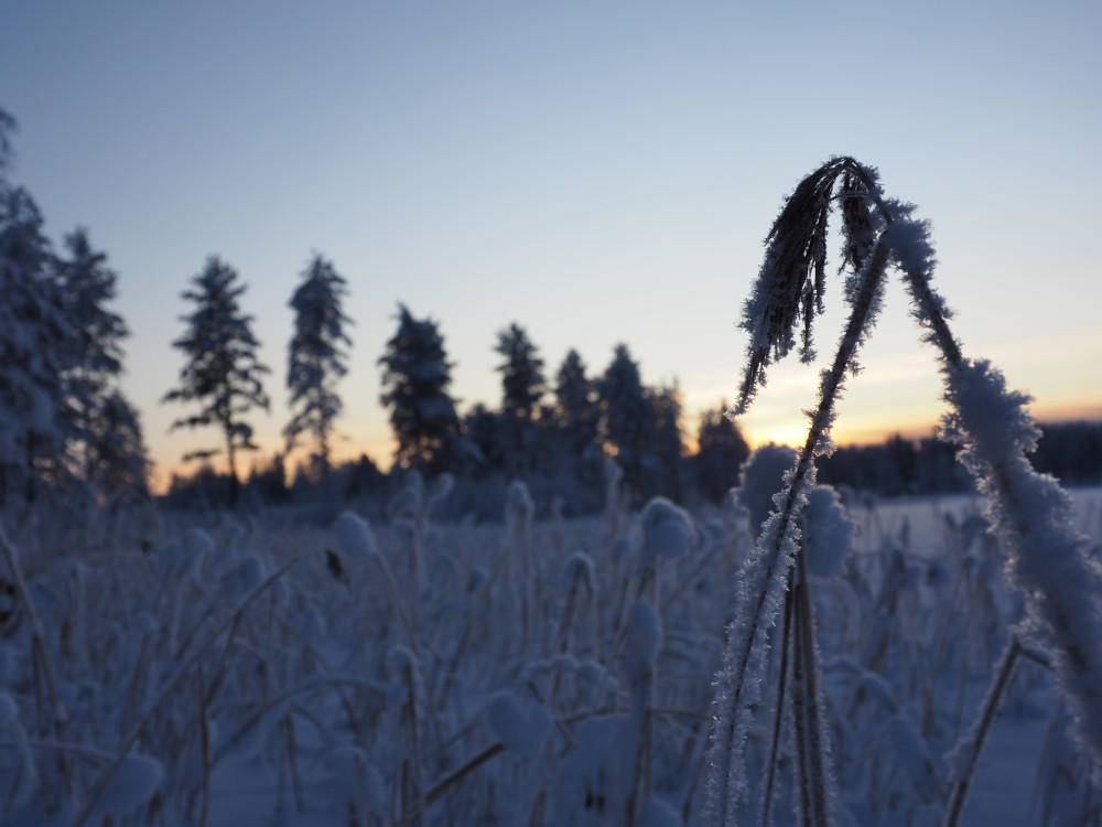Lumière bleu clair sur la rivière qui coule silencieusement, neige blanche sur les sapins qui semblent pencher leur cime vers nous tandis que nous cherchons les étoiles depuis la clairière… Des traces de lapins et d’élans, de la barbe de troll (sorte de lichen dont les rennes sont très friands) qui pend aux arbres, un chien de berger qui tantôt nous devance, tantôt se repose en marchant dans nos traces, un étang gelé et un marais figé par le froid… pour moi, cette balade était féérique.