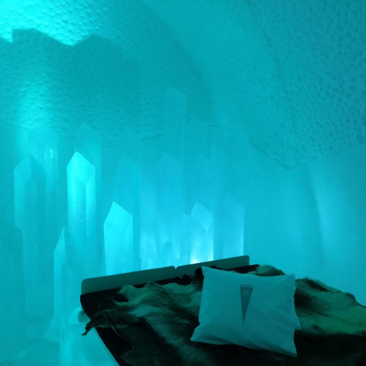 Nous n’avons pas choisi de dormir là-bas (il faut dire que ça coûte plutôt cher, et puis payer si cher pour dormir dans un lit de glace, même avec une peau de renne, la frileuse que je suis passe volontiers son tour). Mais la visite est possible sans dormir, et nous avons choisi cette option. Avec un méga bonus auquel nous ne nous attendions pas : nous étions précisément le jour de l’ouverture de l’hôtel construit cette année-là ! Lorsque nous sommes arrivés, on nous a dit qu’à 17h se déroulerait l’inauguration et que pour l’occasion, comme nous étions le 13 décembre, il y aurait un concert de Sainte-Lucie dans le hall.