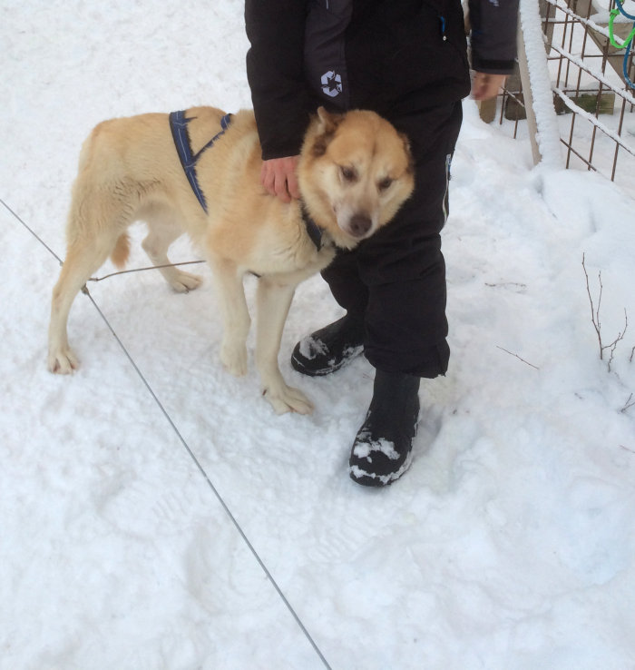 Nous avons consacré deux journées à cette activité : deux jours au terme desquels, si vous êtes rien qu’un peu impliqués, vous connaissez tous les chiens par leur prénom et vous commencez à avoir vos petits chouchous. Pour moi, c’était Dijo. Contre toute attente d’ailleurs, car pour tout vous avouer, j’ai depuis l’enfance une appréhension avec les chiens. Pas une peur, mais une appréhension certaine. Or, Dijo est un groenlandais, un énorme chien blanc crème, parmi les plus imposants de la meute à mes yeux. Mais Dijo est calme, comme la plupart des chiens de la meute d’ailleurs, car c’est une caractéristique encouragée et développée par ce musher. Et surtout, Dijo adore les gratouilles et une fois qu’il a trouvé une bonne âme qui en prodigue sans limite pour peu qu’il soit un peu collant, il ne la lâche plus. Oui, j’ai été cette bonne âme et non, je ne regrette rien :-).