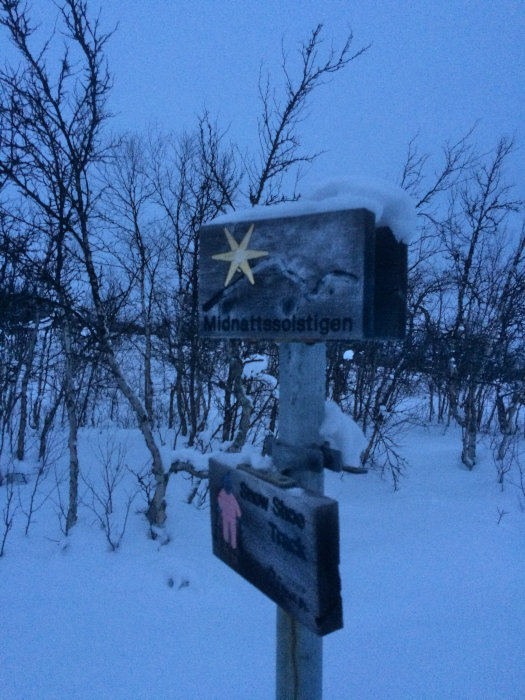 A Kiruna, nous avons choisi cette tranche horaire pour aller marcher un peu sur le Sentier du Soleil de minuit et goûter notre première expérience polaire. Pour toute randonnée, surtout dans un environnement inconnu, il faut se renseigner avant de partir sur l’état du chemin et la météo, ce que nous avons fait à l’office du tourisme puis à l’hôtel Camp Riban, qui est situé au départ du sentier. Ainsi nous savions que le chemin n’était pas tracé jusqu’au bout et qu’il nous faudrait faire demi-tour à un moment. Cela ne nous a pas empêché de nous imprégner de la nature, des odeurs, de la lumière, de la température, nous répétant à chaque pas que « oui, nous sommes au-delà du Cercle polaire, tu te rends compte » ! Des bouleaux constituaient la majeure partie de la végétation, et puis il y avait la neige sous nos chaussures et parfois jusqu’à nos genoux (ça, c’était juste avant de faire demi-tour…). En soit le paysage n’était pas exaltant, surtout que le temps était très nuageux. Mais c’était notre premier contact avec la nature polaire, et pour ça c’était vraiment extraordinaire.