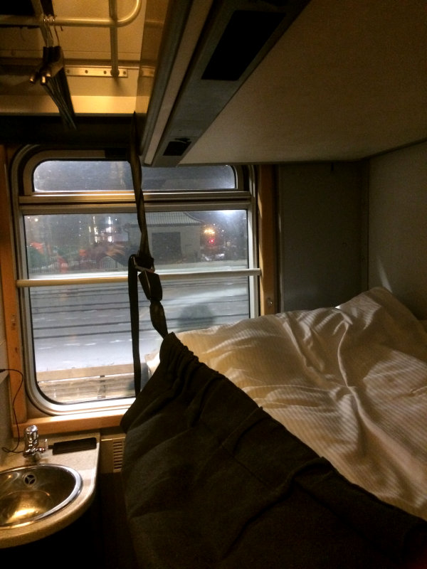 C’est ce que nous avons fait et nous ne l’avons pas regretté, car c’est vraiment étroit, même à deux seulement. Et puis nous avons pu profiter à notre rythme sans craindre de déranger. C’est très bien équipé, il y a un petit lavabo dans le compartiment, des couettes bien chaudes et propres, et même des serviettes et du savon pour aller prendre sa douche. On est assez loin du train de nuit Metz-Avignon je dois l’avouer. Pour le confort, ça reste quand même un train, ne vous attendez pas à une nuit réparatrice. J’avais la couchette du milieu et, de mon oreiller, pendant mes phases d’éveil, je pouvais regarder le paysage défiler. A la lueur des éclairages dans les villes et les gares, je voyais l’épaisseur de la couche de neige augmenter à mesure que nous roulions vers le nord. Au matin je me suis réveillée dans une lueur bleue foncée et la neige était partout. C’était magique.