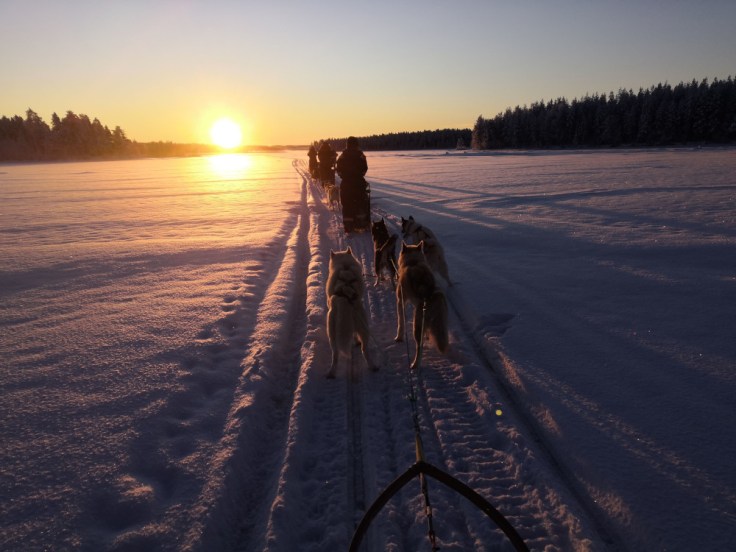 C’est une expérience extraordinaire d’être ainsi avec sa petite équipe, de les encourager, de les féliciter chaleureusement quand ils ont passé sans encombre un endroit délicat, de les remercier au moment des pauses (et de les rejoindre piteusement quand ils se sont arrêtés devant parce que vous avez giclé du traîneau…). Et tout cela dans un paysage à couper le souffle. La forêt enneigée d’abord, les marais figés, et puis le fleuve Skellefteå… Une des plus belles images qui me reste, c’est ce moment où nous glissions en silence sur le fleuve gelé, dans la lumière du petit jour polaire… un rêve éveillé.