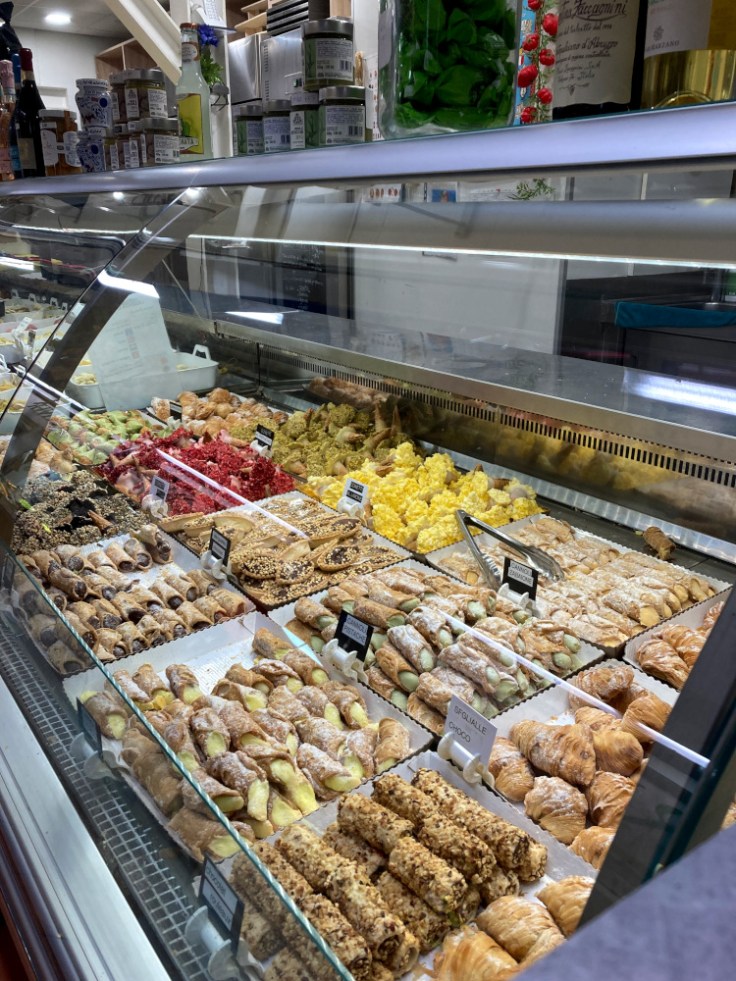 Prise au marché couvert de Metz. Il s’agit du stand du traiteur italien, partie desserts 🙂 Avez-vous repéré les cannolis siciliens ?