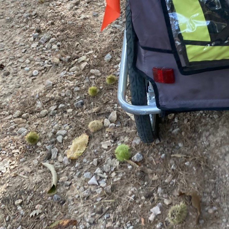 Après les Nonières, ça descend, c’est plus facile. Le chemin était jonché de châtaignes, le plus souvent encore dans leur bogue. Bébé Chardon s’en est même pris une sur le toit de sa carriole ! Il était néanmoins assez facile d’éviter de rouler sur les bogues piquantes.