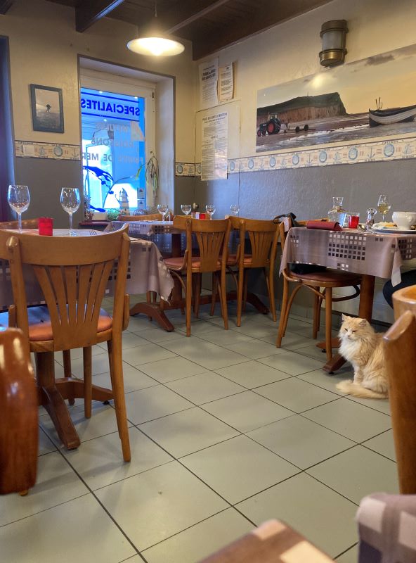 😸 Argument décisif pour nous, il y a un chat de restaurant qui surveille le service depuis sa place centrale près du poêle… ou qui monte la garde l’air de rien près des tables où on consomme du poisson.
